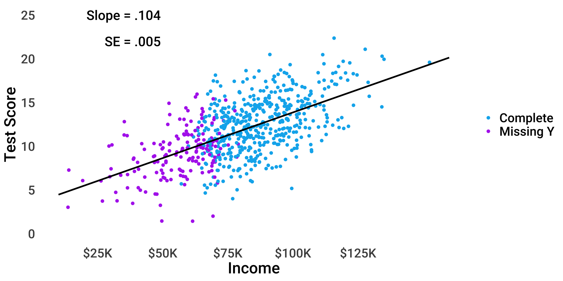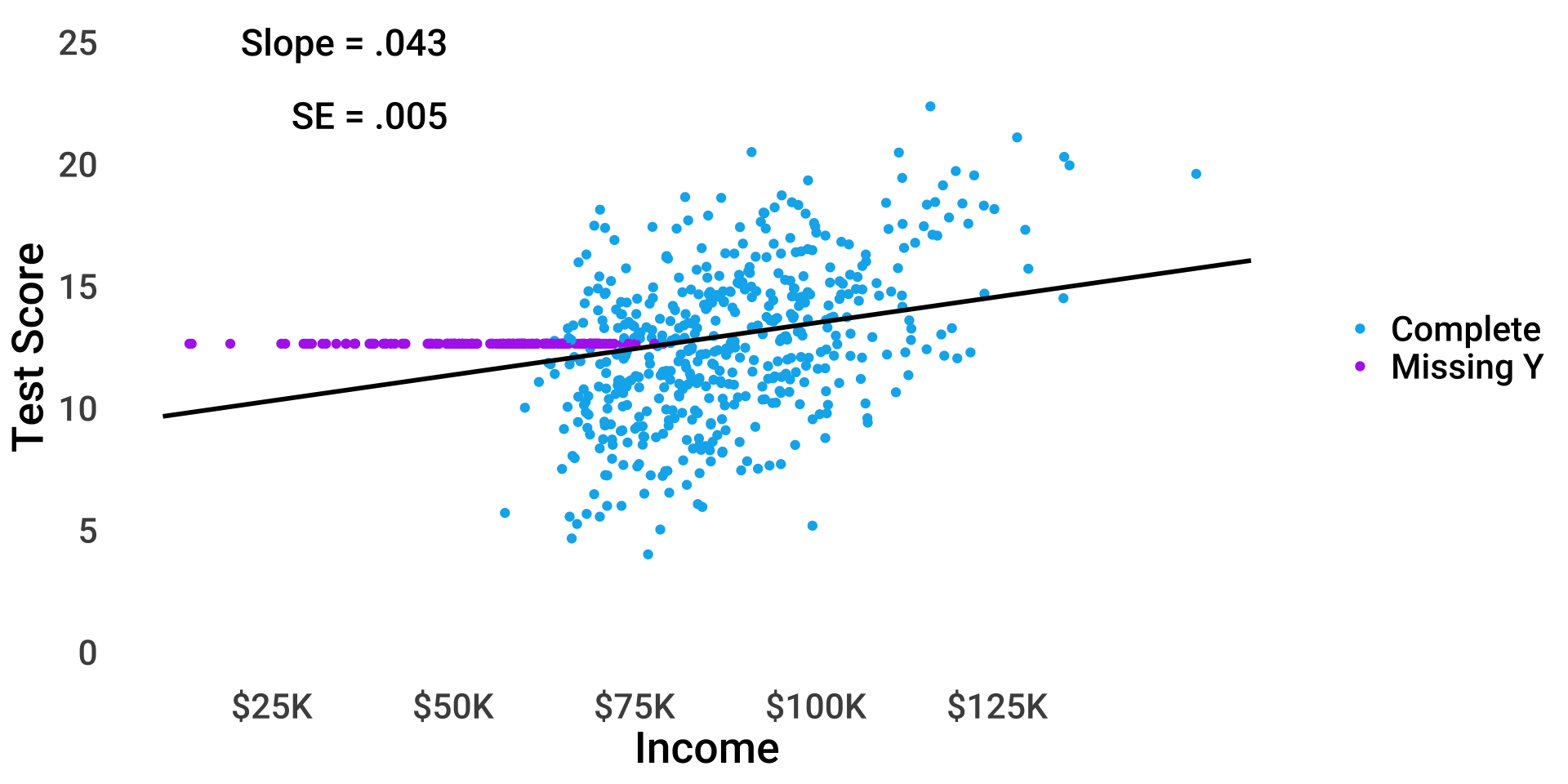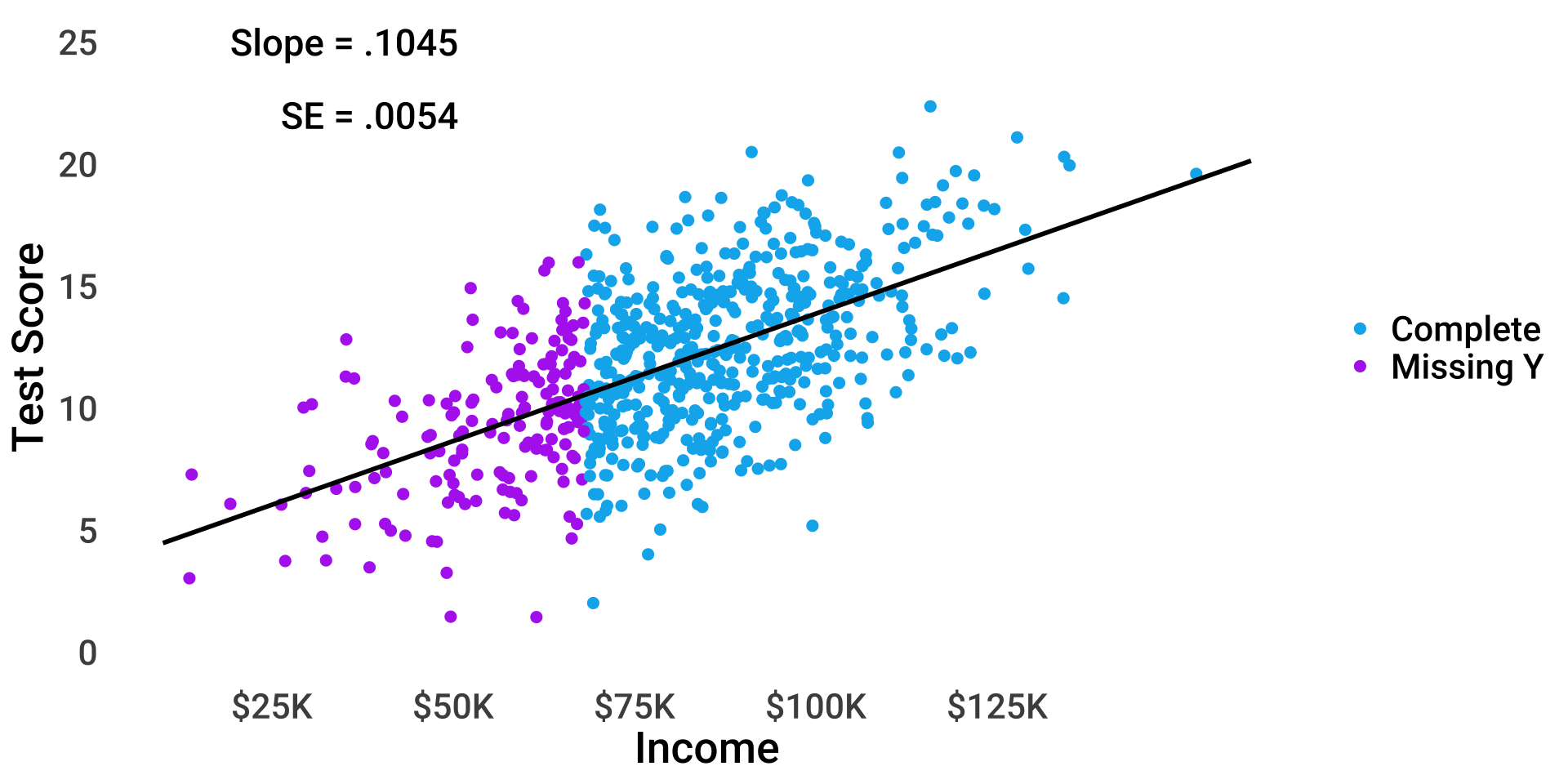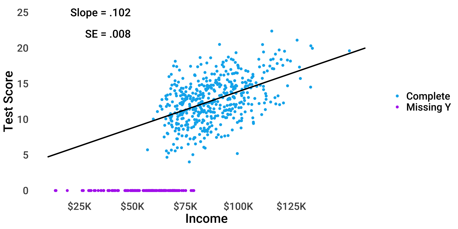 \(test_i = \beta_{0(obs)} + 0.6 \times miss_i + \beta_1 income_i + \epsilon_i\)