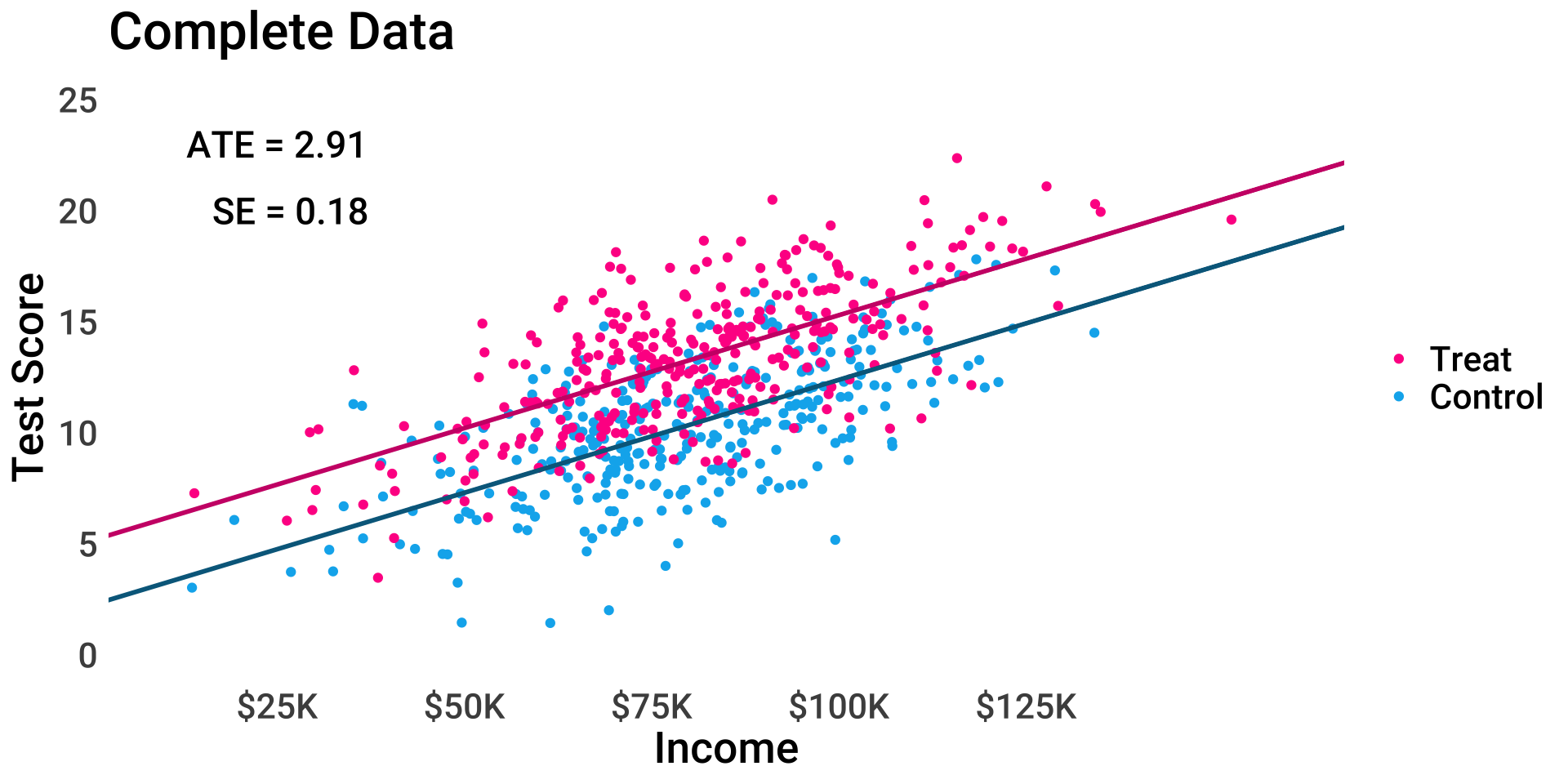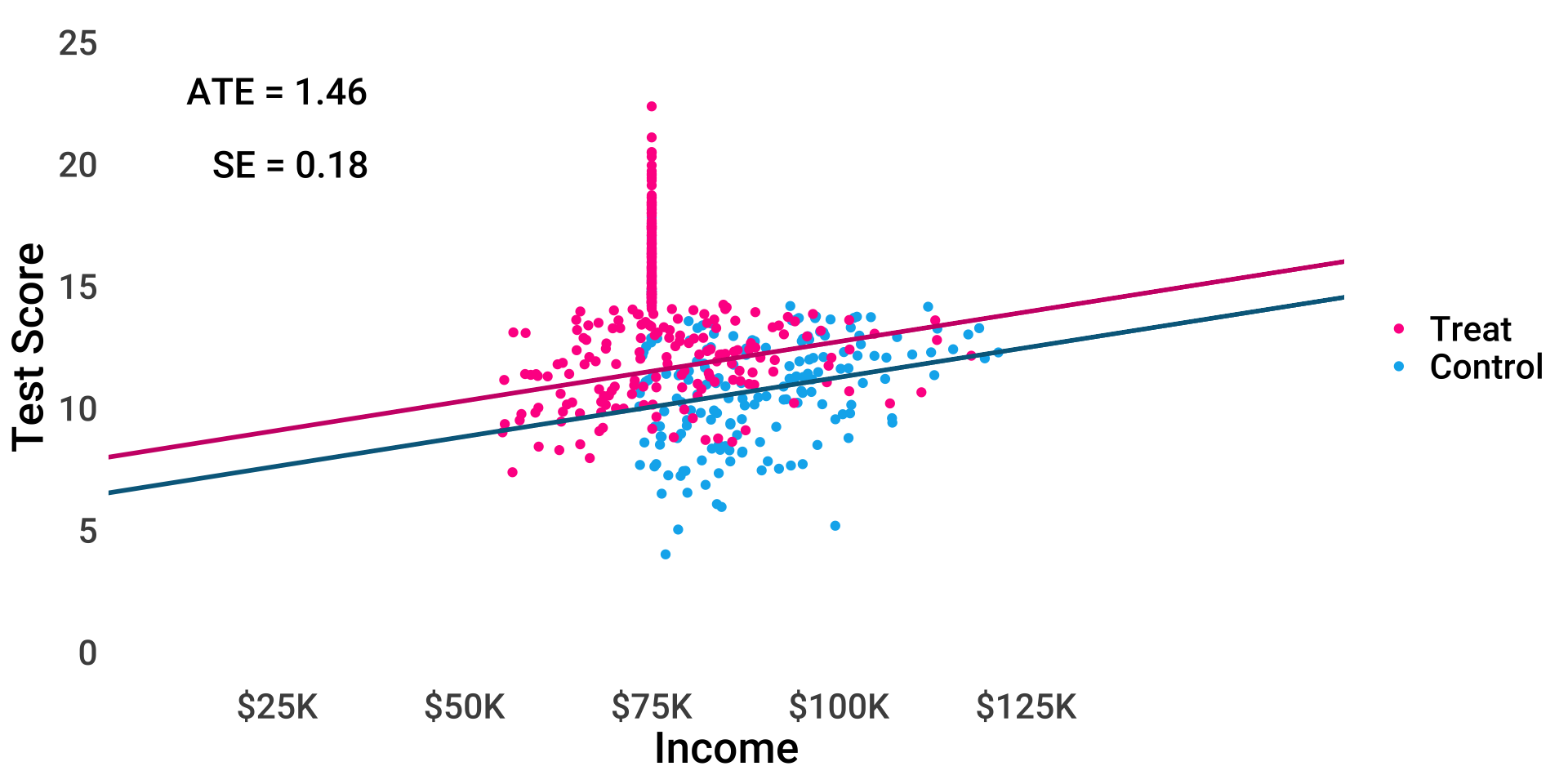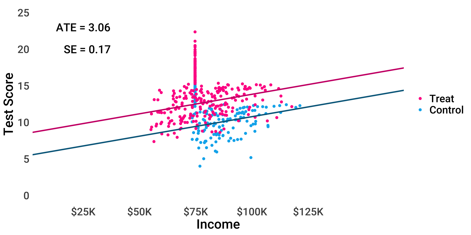 \[ test_i = \beta_0 + \beta_1 treat_i + \beta_2 income_i + \epsilon_i \]