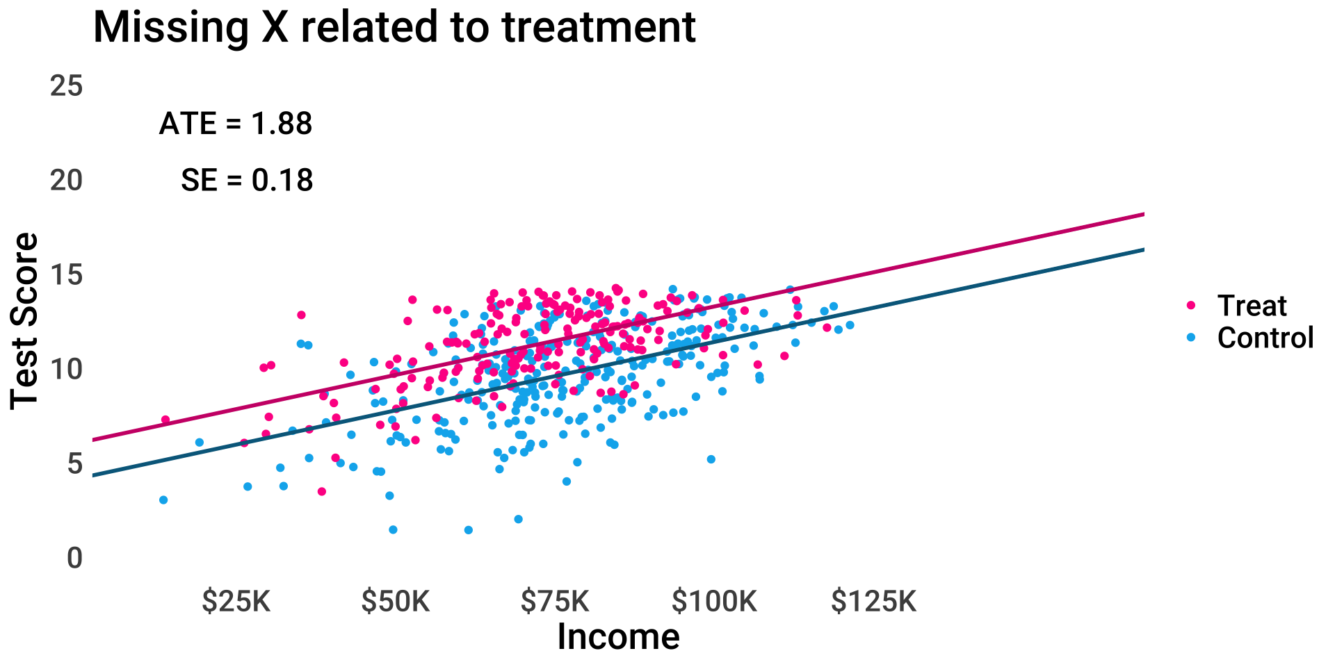 \(P(miss_{test}) = f(income, treat)\)